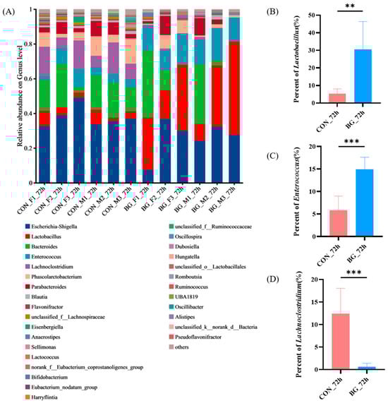 Alterations in intestinal flora due to BG136. (A) Comparison of community composition between CON_72 h and BG_72 h at the genus level (n = 6). Comparison of the percentage of (B) Lactobacillus, (C) Enterococcus, and (D) Lachnoclostridium. CON_72h: fermentation without carbohydrate addition for 72 h; BG_72h: fermentation with BG136 supplement for 72 h. F: female; M: male. **: p < 0.01, ***: p < 0.001.