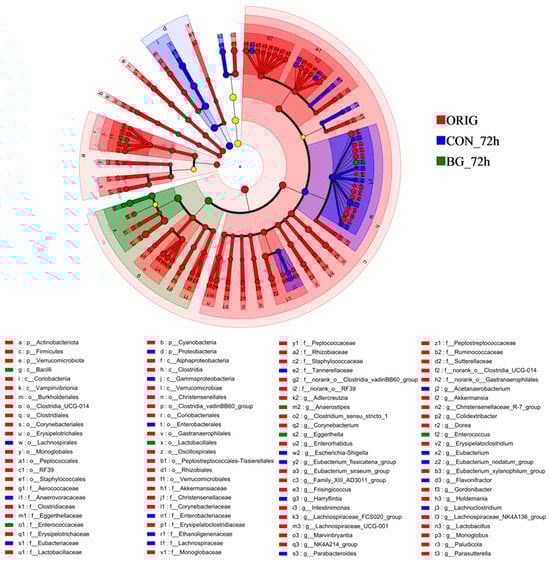Lefse analysis of gut microbiota. ORIG: the initial gut microbiota without fermentation; CON_72h: fermentation without carbohydrate addition for 72 h; BG_72h: fermentation with BG136 supplement for 72 h.
