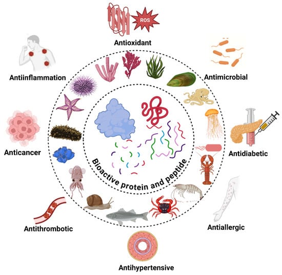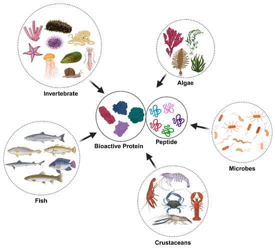 Marine environments comprise more than 70% of the Earth’s surface, an unparalleled biodiversity reservoir. These ecosystems host an extraordinary combination of organisms, ranging from microscopic phytoplankton to massive marine mammals, all of which have evolved to thrive under unique and often extreme conditions. These adaptations have been directed to producing bioactive molecules, including peptides and proteins, with distinct structural features, diversity, and functional properties compared with substances isolated from terrestrial plants [1,2].