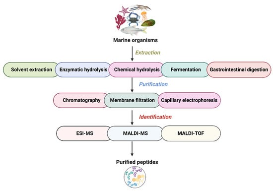 Furthermore, advances in extraction and analytical techniques have facilitated the identification and characterization of bioactive peptides and proteins from marine sources. Bioactive peptides can be produced from protein by hydrolysis using conventional methods or advanced methods, including acid or alkaline, solvent extraction, enzymatic hydrolysis, microbial fermentation, ultrasound, pulsed electric field, pressurized liquid, and subcritical water extraction techniques [10]. Compared with other methods, the enzymatic hydrolysis method is preferred in the food and pharmaceutical industries because the other methods can leave residual organic solvents or toxic chemicals in the final products [11]. Marine-derived peptides, obtained through protein degradation methods, often contain impurities that can hinder their functionality and effectiveness. Advanced separation and purification techniques are essential to enhance these bioactive compounds’ physical activity and purity to harness their full potential. Purification is a critical step, especially when preparing peptides for consumer applications, as it ensures the desired level of quality and effectiveness. State-of-the-art methods such as ultrafiltration, gel filtration chromatography, ion-exchange chromatography, and reversed-phase high-performance liquid chromatography (RP-HPLC) are commonly employed to achieve this. For instance, immunoregulatory peptides derived from Stolephorus chinensis were successfully isolated through process optimization, ultrafiltration, ion-exchange chromatography, and RP-HPLC. These advanced techniques not only improve the purity of the peptides but also maximize their bioactive properties, paving the way for their application in pharmaceuticals, nutraceuticals, and functional foods [12,13,14,15].