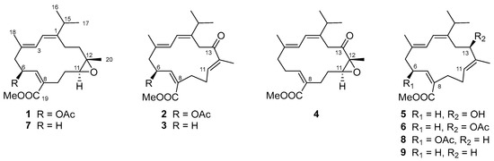 All isolated compounds 1–9 showed characteristic NMR signals consistent with the cembrane-type diterpenoid framework, featuring a conjugated diene moiety. The structural novelty of new compounds 1–6, compared to the co-occurring known compounds 7–9 [10,12] mainly manifested in their degree of oxidation and the specific substitution patterns of the acetoxy group. The geometry of double bonds Δ1,2 and Δ3,4 was assigned to the E configuration for all compounds, supported by the clear NOESY correlations of H-2/Me-16 and H-2/H-18. Furthermore, oxidation and esterification that occurred on C-19 in compounds 1–6 resulted in the formation of a 19-methyl ester, as confirmed by HMBC correlations from H-7 to C-19 and from OMe-3′ to C-19 (Figure 2). These structural features highlight the unique chemical modifications and diversity within this class of cembranoids.