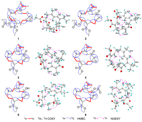 1H–1H COSY, selected key HMBC, and NOESY correlations of 1–6.