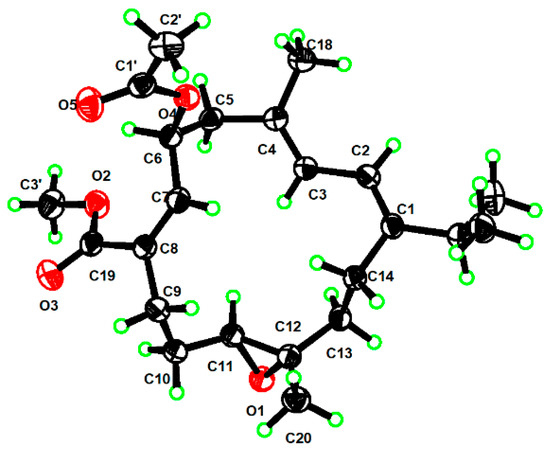 Compound 1 was isolated as colorless crystals with a melting point of 118.2–119.0 °C. Its molecular formula, C23H34O5, was determined by the HR-ESIMS quasi-molecular ion peak at m/z 413.2305 ([M + Na]+, calcd. for C23H34O5Na, 413.2298), indicating seven degrees of unsaturation. The IR spectrum of 1 displayed absorption at 1740 cm−1, suggested the presence of a carbonyl group in its molecules. The 1H and 13C NMR data (Table 1 and Table 2) of 1 were reminiscent of the co-occurring compound 7, xiguscabrate B, a known cembranoid previously isolated from the South China Sea soft coral Sinularia scabra [12]. Careful comparison of the NMR data of 1 and 7 revealed that the main difference between them happened at C-6. The 13C NMR chemical shift in C-6 in 1 was obviously downfield shifted (δC 27.0 in 7 and 71.5 in 1), indicating that acetoxylation occurred at the C-6 of 1, which was in agreement with the diagnostic HMBC cross-peaks of H-6 (δH 6.01) to C-1′ (δC 170.2) and the 42 mass units difference between their ESIMS data. Subsequently, a detailed analysis of the 1H–1H COSY and HMBC correlations established the planar structure of 1 as shown in Figure 2.
