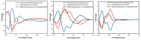 The assignment of the absolute configuration of 2, 4 and 5 by comparing TDDFT-ECD calculated and experimental ECD spectra.
