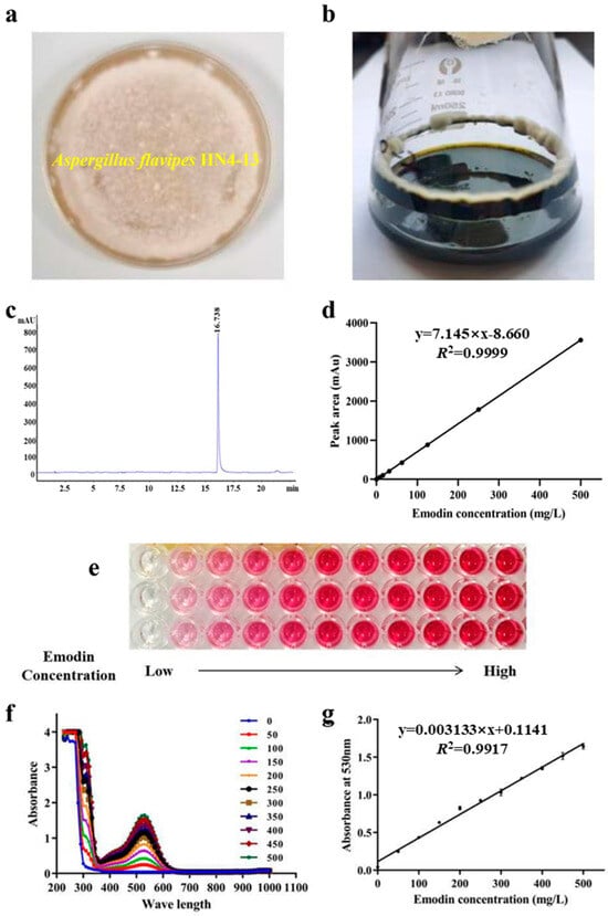 Convenience methods for emodin detection. (a) Morphology of A. flavipes HN4-13 on solid plate medium. (b) Growth of A. flavipes HN4-13 in shaker liquid fermentation. (c) HPLC chromatogram of emodin. (d) Standard curve for emodin concentration determination based on HPLC analysis. (e) Color variation of emodin standard solutions (0–500 mg/L) under alkaline conditions, showing red in a 96-well plate. (f) Full-wavelength absorbance scan (230–1000 nm) of emodin standard solution. (g) Standard curve of emodin absorbance at 530 nm.