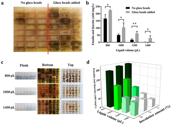 Optimization of fermentation conditions for high yield emodin in 48-well plate. (a) Comparison of fermentation broth color with and without glass beads addition (right to left) observed at the bottom of the 48 deep-well plate. (b) The statistical analysis of emodin and questin production under different liquid volumes with or without glass beads (* p < 0.05, ** p < 0.01). (c) Growth state of the fermentation broth observed from the flank, bottom, and top of the 48-deep-well under different medium filling volumes. (Glass beads were not added in the left three columns of each plate but were added in the right three columns). (d) Effects of liquid volume and inoculum size on emodin and questin yield.