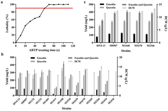 ARTP mutagenic lethal curve and emodin high-yield strain selection results. (a) ARTP mutagenic lethal curve showing the relationship between treatment time and lethality rate. (b) Shake flask yields of 13 mutants with the highest yields selected from the primary screening. (c) Confirmation of yields and dry cell weight (DCW) for four emodin high-yielding strains.