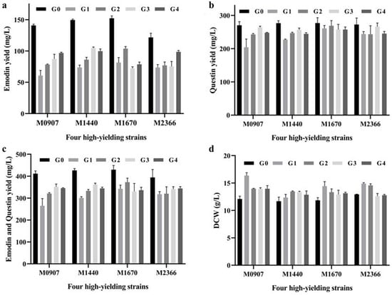 Genetic stability analysis of four high-yielding strains. (a) Emodin yield. (b) Questin yield. (c) Combined yield of emodin and questin. (d) Dry cell weight (DCW).
