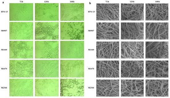 The mycelia of wild-type strain HN4-13 remained slender and stable across all three time points (72 h, 120 h, and 168 h). In contrast, the morphology of mutants M0907 and M1670 became increasingly heterogeneous over time, with coexisting mycelia of varying thicknesses. The mycelia of M1440 exhibited progressive thickening at each time point, while M2366 demonstrated pronounced thickening at 168 h compared to 72 h, as shown in Figure 5b. Scanning electron microscopy (SEM) analysis confirmed that none of the four high-yielding mutant strains exhibited rough or bifurcated surfaces, indicating the absence of significant stress or damage during growth. The inconsistent mycelial thickness observed in M0907, M1670, and M2366 may reflect different growth stages of the cells. Notably, M1440 exhibited a consistent increase in mycelial thickness following mutagenesis, with pronounced morphological changes over fermentation time.