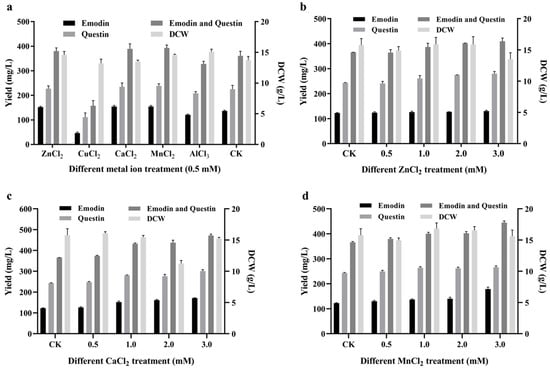 The supplementing of metal ions into the growth medium is a proven strategy for enhancing the production of fermentation [36]. As shown in Figure 6a, the addition of 0.5 mM of five different metal ions at 48 h of fermentation resulted in similar DCWs compared to controls, indicating that 0.5 mM metal ions did not significantly affect fungal growth. The addition of CuCl2 significantly reduced emodin yield, while AlCl3 reduced the total yield of both questin and emodin by 12.0%. Therefore, these two metal ions are not conducive to emodin synthesis. Conversely, the addition of ZnCl2, CuCl2, and MnCl2 stimulated the production of both emodin and questin, warranting further exploration of the effects of varying concentrations of these three metal salts on emodin synthesis.