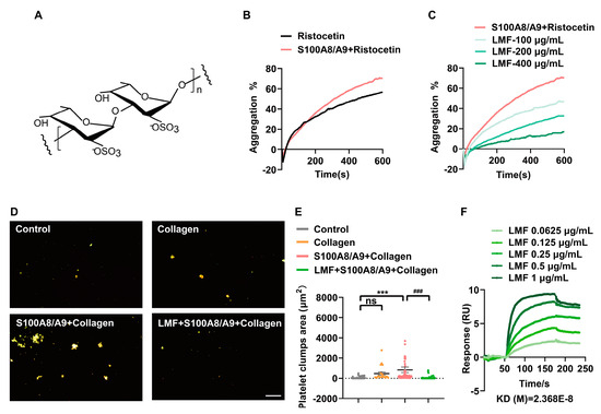 Washed human platelets (2 × 108 cells/mL) were pre-incubated with VWF (2 μg/mL), S100A8/A9 (20 μg/mL), or vehicle (control) for 5 min at 37 °C. Platelet aggregation was carried out in the presence of constant stirring at 1000 rpm/min by an aggregometer. (A) Structure of fucoidan from Fucus vesiculosus. (B) Ristocetin (1 mg/mL)-induced platelet aggregation with S100A8/A9 (20 μg/mL). (C) LMF dose-dependent inhibited ristocetin-induced platelet aggregation in the presence of S100A8/A9. (D) The effect of LMF (200 μg/mL) on the formation of platelet clumps induced by S100A8/A9 (20 μg/mL) and collagen (2 μg/mL). (E) Statistical analysis of the area of platelet clumps. (F) Traces from SPR analysis show the interaction between LMF and S100A8/A9 immobilized on Sensor Chip CM5. The values of p were determined by one-way ANOVA followed by post hoc Dunnett’s test. ns—not statistically significant (p > 0.05); *** p < 0.001; ### p < 0.001.