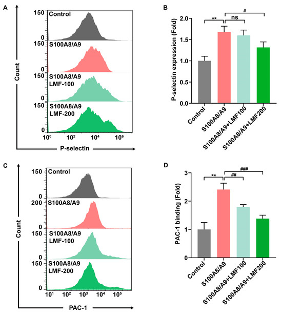 Flow cytometry was employed to assess the effect of LMF on S100A8/A9-induced platelet activation. Isolated human platelets (2 × 106 cells/mL) were incubated with various concentrations of LMF or vehicle (control) for 10 min at 37 °C. (A,B) The role of LMF (100 μg/mL and 200 μg/mL) in the P-selectin expression on the platelet surface induced by S100A8/A9 (20 μg/mL). (C,D) The effect of LMF (100 μg/mL and 200 μg/mL) on the PAC-1 binding to platelets induced by S100A8/A9 (20 μg/mL). The values of p were determined by one-way ANOVA followed by post hoc Dunnett’s test. ns—not statistically significant (p > 0.05); ** p < 0.01; # p < 0.05; ## p < 0.01; ### p < 0.001.