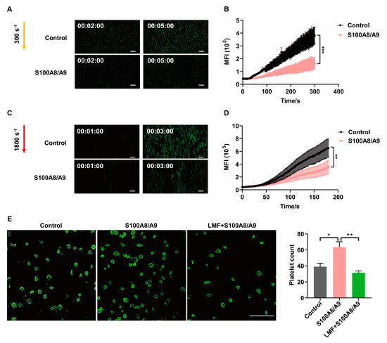 To investigate the impact of S100A8/A9 on thrombus formation under different shear conditions, an ex vivo perfusion chamber system was established as previously described [16]. The μ-Slide (μ-Slide VI 0.1, ibidi, Bavaria, Germany) was coated with 50 μg/mL of collagen (AG005K, HYPHEN, IDF, France) and incubated overnight at 4 °C. Sodium citrate-anticoagulated whole blood samples from healthy volunteers were labeled with 3,3′-dihexyloxacarbocyanine iodide (1 μM, DiOC6, Sigma) and subsequently preincubated with S100A8/A9 for 5 min at room temperature. The blood was circulated over the collagen-coated surface using a syringe pump (TYD01-01, Lead Fluid, Baoding, China) at shear rates of 300 s−1 and 1800 s−1. Thrombus formation was monitored in real-time using a fluorescent microscope (Novel Optics, Ningbo, China, NIB 900 inverted) equipped with a 10× objective, and quantitative dynamics of platelet fluorescence intensity were analyzed with SlideBook software 5.5 (Intelligent Imaging Innovations, Denver, CO, USA).