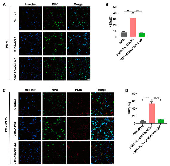 Neutrophils were isolated from healthy donors using the Human Peripheral Blood Neutrophil Isolation Kit (P9040, Solarbio, Beijing, China) with modifications [8,50]. Initially, sodium citrate-anticoagulated blood was separated using a gradient separator and centrifuged (1000 g, 30 min) at room temperature. The neutrophil layer was carefully collected, washed with PBS, purified using a red cell lysis buffer, and then resuspended in a pre-warmed RPMI 1640 medium with a 1% penicillin/streptomycin mixture. Neutrophils (1 × 107 cells/mL) were placed on polylysine-coated slides at 37 °C for 30 min, with or without platelets treated with LMF or S100A8/A9. Immunofluorescence staining was performed using anti-human CD41a (133903, Biolegend, San Diego, CA, USA), MPO monoclonal antibody (11-1299-42, Invitrogen), and Hoechst 33342 (HY-15559, MCE, Monmouth Junction, NJ, USA), and NET formation was observed by confocal microscopy.