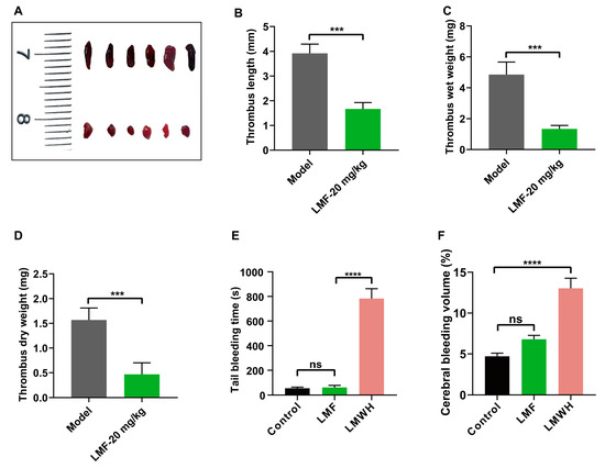 (A) Representative images of thrombi from DVT models. Mice (n = 6 per group) received injections of LMF (20 mg/kg) or vehicle (control) subcutaneously. Thrombus was induced by IVC ligation as described in Materials and Methods. After 8 h of surgery, thrombi were excised from IVC for measurements. Statistical analysis of (B) thrombus length, (C) wet weight, and (D) dry weight of the isolated thrombi. (E) Tail transection bleeding time following treatment with LMF (20 mg/kg) or low-molecular-weight heparin (LMWH, 4 mg/kg). (F) The effect of LMF and LMWH on collagenase-induced cerebral bleeding. The values of p were determined by one-way ANOVA followed by post hoc Dunnett’s test. ns—not statistically significant (p > 0.05); *** p < 0.001; **** p < 0.0001.