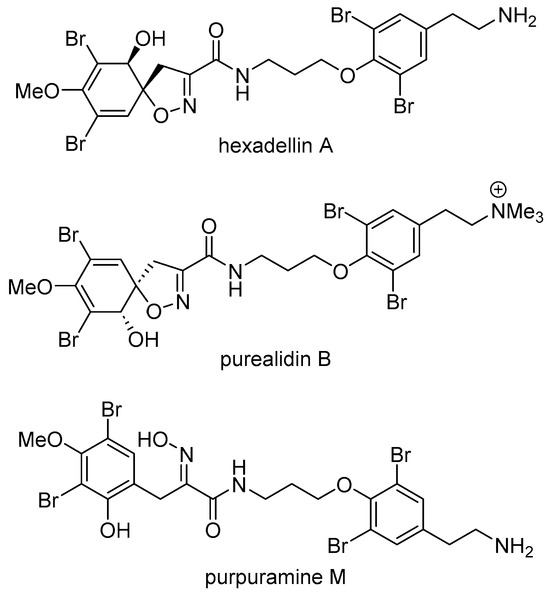- Niemann, H.; Marmann, A.; Lin, W.; Proksch, P. Sponge derived bromotyrosines: Structural diversity through natural combinatorial chemistry. Nat. Prod. Commun. 2015, 10, 219–231. [Google Scholar] [CrossRef]