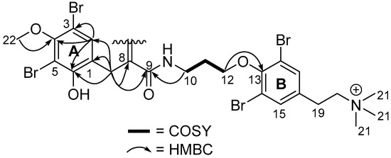 The tyrosine-based moiety of purpuramine R (1) was deduced via HMBC correlations from methine H-6 to non-protonated carbons, C-3 (δC 108.8), C-4 (δC 154.7). and C-5 (δC 106.8). The chemical shifts of both C-3 and C-5 were shielded to lower frequencies and established connections to the last two bromines. Carbon C-4 was confirmed to be linked to the methoxy CH3-22 (δC 60.8, δH 3.80) by HMBC, positioned para in relation to C-1 and consistent with the 1,3-dibromo-2-O-methoxybenzene (ring A) moieties mostly reported from Verongid sponges. Finally, an HMBC correlation from H2-12 to C-13 established the link between the two spin systems via the 1,2,3,5-tetrasubstitutued benzene ring (ring B, Figure 3).