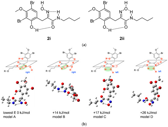 To lower the computational cost, truncated model 2 was used to predict the most stable conformations of the E (2i) and Z (2ii) oxime geometries (Figure 4), recognizing that the trimethylammonium portion should not play a significant role in influencing chemical shifts of the tyrosine moiety of 1. Within each possible geometry, hydrogen bonding between OH-6 and the amide carbonyl, and between the oxime and the amide NH, provides four possible stabilized conformers. Both possible E-geometry conformers were found to be lower in energy than the two corresponding Z-conformers (Figure 4). Prediction of the NMR chemical shifts of these four conformers (Table 1) showed that the CH2-7 methylene chemical shift of purpuramine R matched better to those of the two E geometric stereoisomers than the Z counterparts; gratifyingly, these also match closely to those observed empirically by Arabshahi and Schmitz [19]. The structure of purpuramine R was therefore established as 1. The NMR data of 1 are presented in Table 2.