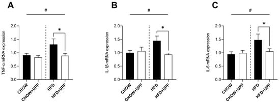 Effects of UPF on skeletal muscle gene expression. mRNA levels of (A) TNF-α, (B) IL-1β, and (C) IL-6. n = 11–16. Results are expressed as mean ± SEM. Data were analysed by one-way ANOVA, followed by post hoc LSD tests. #, p < 0.05, overall difference between (CHOW and CHOW+UPF) vs. (HFD and HFD+UPF). *, p < 0.05, difference between CHOW vs. CHOW+UPF and HFD vs. HFD+UPF.