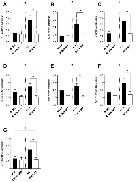 Effects of UPF on small intestine gene expression. mRNA levels of (A) TNF-α, (B) IL-1β, (C) IL-6, (D) NF-κB, (E) Tjp1, (F) GPR41, and (G) GPR43. n = 7–15. Results are expressed as mean ± SEM. Data were analysed by one-way ANOVA, followed by post hoc LSD tests. #, p < 0.05, overall difference between (CHOW and CHOW+UPF) vs. (HFD and HFD+UPF). *, p < 0.05, difference between CHOW vs. CHOW+UPF and HFD vs. HFD+UPF.