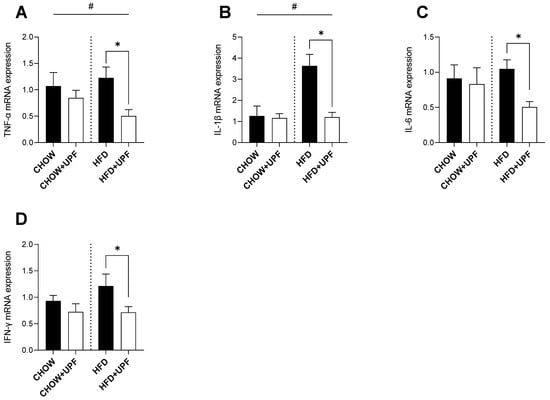 Effects of UPF on hypothalamic gene expression. mRNA levels of (A) TNF-α, and (B) IL-1β. n = 7–10. Results are expressed as mean ± SEM. Data were analysed by one-way ANOVA, followed by post hoc LSD tests. #, p < 0.05, overall difference between (CHOW and CHOW+UPF) vs. (HFD and HFD+UPF). *, p < 0.05, difference between CHOW vs. CHOW+UPF and HFD vs. HFD+UPF. (C) IL-6, and (D) IFN-γ. n = 7–10. Results are expressed as mean ± SEM. Data were analysed by unpaired t-test. *, p < 0.05, difference between HFD vs. HFD+UPF.