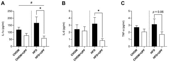 Although UPF supplementation led to a reduction in TNF-α levels (−45.2%; Figure 4C), this effect was not statistically significant (p = 0.06). No statistically significant changes were observed in mice consuming a chow diet.