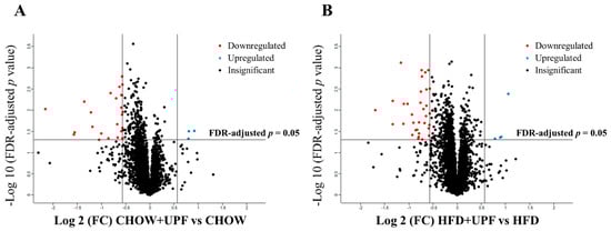 Volcano plot of proteomic changes in mice NAc. (A) CHOW+UPF vs. CHOW, and (B) HFD+UPF vs. HFD. Proteins that were statistically significantly different relative to the control groups for their respective diets are shown above the horizontal line in red (reduced abundance in the UPF group) or blue (increased abundance in the UPF group).