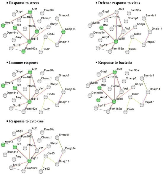 To further investigate the molecular functions and biological implications of these DEPs, in silico analysis was performed using STRING, a protein–protein interaction (PPI) network tool. This analysis revealed the key biological processes associated with the 20 downregulated DEPs in the CHOW group, including stress response, viral defence, cytokine response, immune response, and bacterial defence (Figure 6).