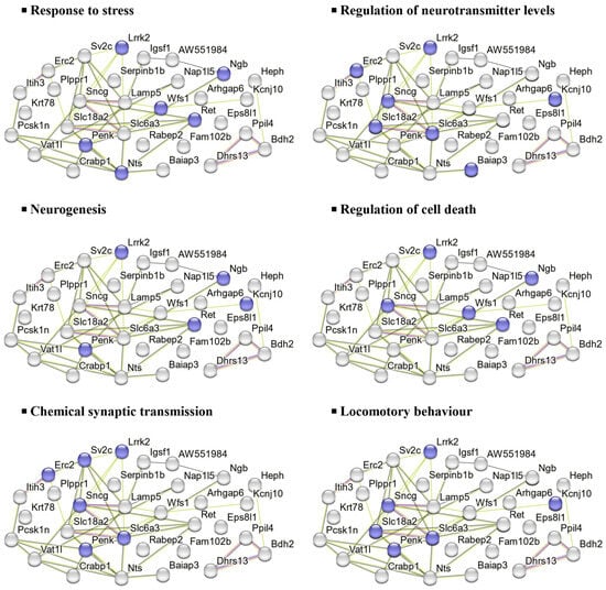Similarly, the 32 downregulated DEPs in the HFD group were associated with processes such as stress response, neurotransmitter regulation, neurogenesis, cell death regulation, and synaptic transmission, as shown in Figure 7.