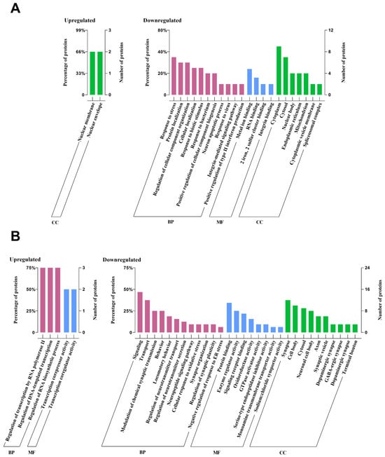 Functional annotation histogram of DEPs. (A) CHOW+UPF vs. CHOW, and (B) HFD+UPF vs. HFD. Biological process (BP), molecular function (MF), and cellular component (CC) mainly related to the DEPs. The histograms represent the main categories for each GO term in which the upregulated and downregulated DEPs were involved (FDR-adjusted p-value < 0.05). The x-axis shows the biological activity, and the y-axis shows the percentage and count of proteins involved in this process among the total proteins in the database.
