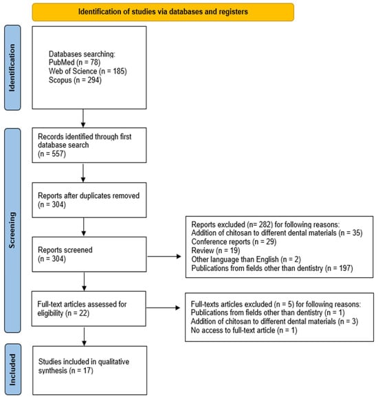 An initial database search yielded 557 scientific articles that potentially met the inclusion criteria for the present systematic review. Subsequent to the elimination of duplicates, the number of entries was reduced to 304. The subsequent screening of titles and abstracts resulted in the exclusion of 282 entries, with 35 of these being excluded on the basis of the addition of chitosan to different dental materials, 29 due to the nature of the conference report, 19 due to the review article type, 2 due to the fact that they were written in a language other than English, and 197 due to their relevance to fields other than dentistry. Consequently, a total of 22 articles were subjected to a thorough assessment to ascertain their eligibility. Following a thorough examination of the full texts, five articles were rejected due to failure to meet the inclusion criteria (one article was deemed to be related to a field other than dentistry, three articles were rejected due to the addition of chitosan to different dental materials, and one article was rejected due to the lack of access to the full text). Consequently, a total of 17 articles were deemed to have met the necessary criteria and were thus selected for inclusion in the systematic review [,,,,,,,,,,,,,,,,]. The scope of these articles pertained to dental resin composites modified with chitosan.