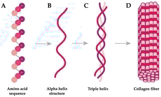 Collagen is the most abundant structural protein in animals and a key component of the extracellular matrix (ECM). Its name in Greek means “gum” (kolla) “producer” (gen), highlighting its connective role in biological structures [23]. The primary structure of collagen consists of repeating triplets of glycine (Gly), proline (Pro), and hydroxyproline (Hyp), which are fundamental to its stability and function (Figure 1A). These polypeptide chains are folded into an alpha helix type, a characteristic secondary structure of collagen (Figure 1B). Three of these helices then intertwine to form a right-handed triple helix, constituting the tertiary structure (Figure 1C). Multiple triple helices subsequently aggregate in a staggered arrangement to form collagen fibrils, the fundamental quaternary structural units responsible for the mechanical strength and integrity of connective tissues (Figure 1D) [23,24,25].