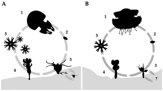 Life cycle of the order Rhizostomeae. (A) Rhizostoma pulmo exhibiting oligodisc strobilation; (B) Cotylorhiza tuberculata exhibiting monodisc strobilation. Life cycle stages: (1) mature medusa; (2) planula, (3) polyp, (4) polyp undergoing strobilation, and (5) ephyra.
