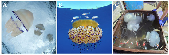 The Mediterranean Sea is recognized as a biodiversity hotspot, harboring a diverse mix of temperate and subtropical biota, along with a significant proportion of endemic species [49]. Among the Rhizostomeae jellyfish, the barrel jellyfish Rhizostoma pulmo (Figure 3A) is the most abundant species, found across both the Eastern and Western Mediterranean basins [50,51,52]. R. pulmo is the largest jellyfish species, with an umbrella diameter reaching up to 40 cm [53], responsible for forming blooms [43,51]. In its life cycle, planulae develop within the female gastrovascular system, and the polyp primarily propagates through podocysts, as well as by longitudinal fission, motile bud-like tissue particles, and lateral budding [43,45]. Each polyp can generate up to eight ephyrae by oligodisc strobilation (Figure 2A) [43,48]. Small jellyfish are visible during the spring, while larger adult individuals are more evident during the summer and early autumn along the Mediterranean coast [53].