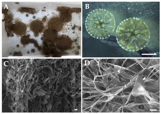 Similar to R. pulmo, Cotylorhiza tuberculata (Figure 3B) forms large blooms in the Mediterranean Sea [51,55]. Recent records have identified occurrences in the Marmara Sea [56] and along the Moroccan Northwest Mediterranean coast [57]. Adult C. tuberculata jellyfish, with an umbrella diameter reaching up to 35 cm, are more abundant in late summer and early autumn along the Mediterranean coast [53]. It is one of the few species that host zooxanthellae algae, which are present in all stages of its metagenetic life cycle, except for the planula stage [55]. C. tuberculata develops planulae inside the female gastrovascular system, and polyps reproduce asexually mainly by free-swimming buds [55]. Unlike R. pulmo, each polyp only produces a single ephyra by monodisc strobilation (Figure 2B). Although yielding less collagen than the barrel jellyfish, C. tuberculata also stands out for its high collagen content when compared with other scyphozoans, with a yield of 1.94 mg per gram of wet tissue in the oral arms [22].