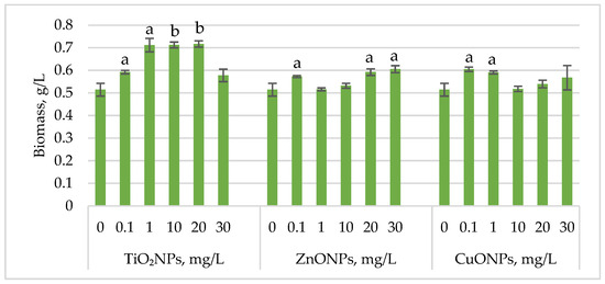 Biomass (g/L) of Haematococcus lacustris accumulated during the green motile stage under the influence of TiO2, ZnO, and CuO nanoparticles. 0—control variant; Statistical significance (Student’s t-test, each treatment compared to control, 0 mg/L): a—p < 0.05; b—p < 0.01. Values are mean ± SD (n = 3).
