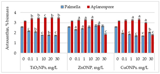 Astaxanthin content (% of dry biomass) in Haematococcus lacustris during the palmella and aplanospore stages under exposure to TiO2, ZnO, and CuO nanoparticles. 0—control variant; Statistical significance (Student’s t-test, each treatment compared to control, 0 mg/L): a—p < 0.05; b—p < 0.01; c—p < 0.001. Values are mean ± SD (n = 3).