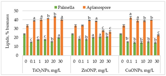 Figure 4 presents the changes in lipid content in Haematococcus lacustris biomass during the palmella and aplanospore stages of development under the influence of TiO2, ZnO, and CuO nanoparticles.