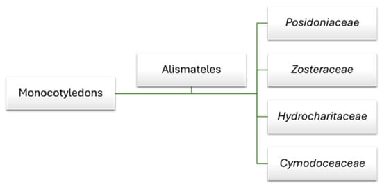 Globally, there are about 60 species of marine flowering plants, with only 4 considered native to the Mediterranean Sea [18]. These species belong to four families: Posidoniaceae, Zosteraceae, Hydrocharitaceae, and Cymodoceaceae, which are all classified within the order Alismatales and the clade of monocotyledons (Figure 1).