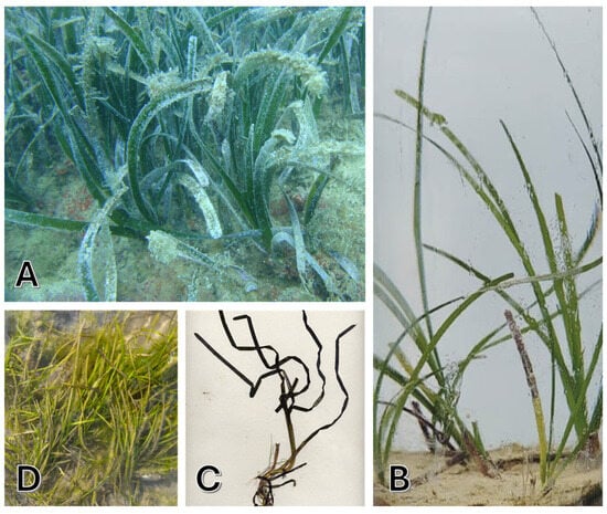 Representative images of the native Mediterranean plants: (A) Posidonia oceanica, (B) Cymodocea nodosa, (C) Zostera marina, and (D) Zostera noltii.
