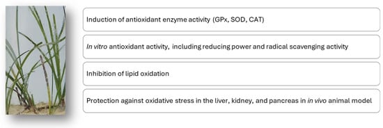 The antioxidant capacity of C. nodosa was first prominently documented by Kolsi et al. (2015). This study represented a significant innovation by thoroughly examining the chemical composition, biological properties, and potential nutritional benefits of a polysaccharide extracted from the leaves of the seagrass C. nodosa [71]. The authors isolated the sulphated polysaccharide from C. nodosa (CNSP) via hot water extraction and analyzed its chemical composition. The polysaccharide fraction was rich in sulphates and carbohydrates, while proteins and lipids were present in moderate and low amounts, respectively. Studies on CNSP in high-fat diet (HFD)-fed rats revealed significant antioxidant activity, evidenced by increased activities of SOD, CAT, and GPx, as well as enhanced reducing power—all of which were strongly dependent on concentration—and protecting the liver and kidneys of rats [71]. In 2017 Kolsi et al. revealed that CNSP exhibits a range of interesting properties, including antioxidant, antimicrobial, and cytotoxic activities, making it a promising candidate for future applications in nutraceuticals and functional foods, as well as in alternative medicine and natural therapies [72]. The results revealed that CNSP had high activity in the total antioxidant assay (59.03 mg AAE/g extract), reducing power (OD = 0.3), DPPH radical scavenging (IC50 = 1.22 mg/mL), and ABTS radical scavenging (IC50 = 1.14 mg/mL). Notably, CNSP demonstrated significant antioxidant activity in Hela cells subjected to oxidative stress induced by Fe2SO4 (100 mM). After oxidative stress induction, it was observed that Hela cells pre-treated with different concentrations of CNSP (0.015, 0.0035 and 0.0015 μg/mL for 72 h) showed a significant reduction in lipid oxidation. These findings open new opportunities for the use of CNSP in preventive and therapeutic strategies, laying the groundwork for future developments in the field of health and wellness [72].