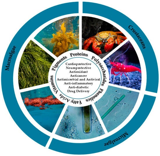 Marine organisms, such as microorganisms, microalgae, macroalgae (seaweeds), sponges and crustaceans (crabs, shrimps, crayfish and lobsters) are known to be sources of a diverse array of compounds, each with a unique chemical structure and properties [5,6,7]. To date, approximately 36,000 compounds have been successfully isolated from marine organisms [6], including proteins [8,9], pigments [10,11,12], polysaccharides [13,14,15], and phenolics [16,17], among others. When the bioactive compounds of marine origin were compared with those of terrestrial life, the former demonstrated higher bioactivity [18]. Therefore, the ocean is regarded as one of the most important sources of natural bioactive compounds [19].