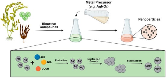 Green synthesis of metallic nanoparticles (MNPs) using algae. Algae biomass or extract is combined with silver nitrate (AgNO3) precursor solution. Algae metabolites, rich in hydroxyl (-OH), amino (-NH2), and carboxyl (-COOH) groups, reduce silver ions (Ag+) to neutral atoms (Ag0), initiating nucleation. The nanoparticles grow and stabilize. The formation of NPs is indicated by a visible color change in the solution.