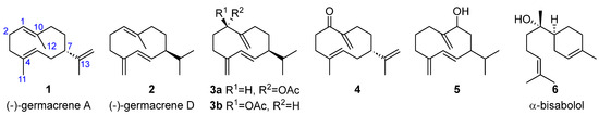 Among the six compounds with the characteristic ten membered monocyclic germacrane skeleton that have been isolated from brown algae, only two non-oxygenated substances with a germacrene structure have been described. In 1990, Segawa et al. isolated, from the methanol extracts of the fresh algae Dyctiopteris divaricata, the already known compound (−)-germacrene A (1) (Figure 1) [15], and in 1994, De Rosa et al. isolated (−)-germacrene D (2) from the brown alga Taonia atomaria from the North Adriatic sea [16].