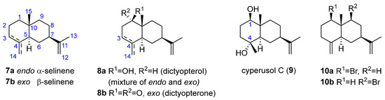 The selinane skeleton has a trans-decalin moiety (Figure 2). Among the seven selinane sesquiterpenes isolated from brown algae, two are non-oxygenated compounds, α-selinene (7a) and β-selinene (7b), which differ in the position of one double bond. Both were isolated from Dictyopteris divaricata in 2009 by Ji et al. [21]. Different functionalized derivatives, mainly oxygenated and halogenated, have also been found. In this regard, two C1-oxygenated structures were isolated from the essential oil of Dictyopteris divaricata Okamura (“Yezoyahazu”) in 1966 by Kurosawa et al. as an inseparable mixture of isomers differing in the position of a double bond: C3-C4 (endo) and C4-C14 double bond (exo). They named the mixture dictyopterol (8a, Figure 2) [22]. In addition, the ketone selinene-1-one (also named dictyopterone, 8b) was also present in the essential oil. In a different study, the C1,C4 di-oxygenated selinene, 1,4-dihydroxyselin-11-ene, named cyperusol C (9), was obtained from Dictyopteris divaricata [21]. Furthermore, two different halogenated derivatives differing in the position of the bromine substituent, 1-bromoselin-4(14),11-diene (10a) and 9-bromoselin-4(14),11-diene (10b), were also isolated and identified from D. divaricata by the same authors [21].