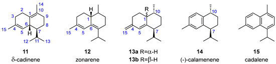 Three cadinane structures with conjugated double bonds have been obtained from brown algae. Zonarene (12) was the first example of a conjugated diene among the cadinane hydrocarbons and was identified as the main hydrocarbon component of Dictyopteris zonaroides by Fenical et al. in 1972 [25]. Two epimeric 4-cadinene compounds were isolated from different algae: (1R)-cadinane-4(15),5-diene (13a) was isolated in 1979 by Amico et al. from Dilophus fasciola [23], and its epimer, (1S)-cadinane-4(15),5-diene (13b), was isolated in 1994 by De Rosa et al. from a sample of Taonia atomaria collected in the North Adriatic Sea [16].