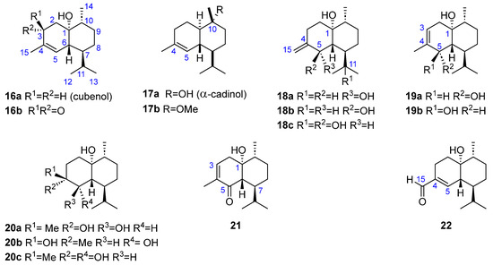 Three cadinanes containing an α,β-unsaturated carbonyl group at various positions have been isolated from D. divaricata, all of which share a common hydroxy group at C-1. Two of these compounds are ketones: cubenol-3-one (16b, Figure 4) [27] and (−)-(1R,6S,7S,10R)-1-hydroxycadinan-3-en-5-one (21) [29]. The third α,β-unsaturated carbonyl derivative is an aldehyde: (−)-(1R,6R,7S,10R)-15-oxocadinan-4-en-1-ol (22) [29].