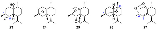 Finally, four additional cadinane oxides and one endoperoxide have been identified in brown algae (Figure 5). Thus, the epoxide 4β,5β-epoxycadinan-1β-ol (23) was isolated from D. divaricata [27]. On the other hand, the 1,4-oxide 1,4-epoxycadinane (24) was found in Taonia atomaria, while its epimer with an extra C5-hydroxy group, 1,4-epoxymuurolan-5α-ol (25), was isolated from D. divaricata [30]. Two additional cadinane oxides were isolated from T. atomaria: the 1,5-oxide 4,10-epoxymuurolane (26) [24] and the endoperoxide 1,4-peroxymuurol-5-ene (27) [18] (Figure 5).