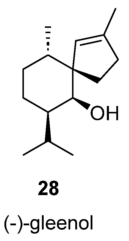 Sesquiterpenoids with a spiro [4.5]decane core are known as spiroaxanes. Only one example in this category has been described in brown algae, (−)-gleenol (28), which was isolated from extracts of T. atomaria [16,18] (Figure 6).