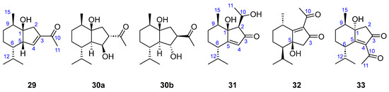 In 2006, Song et al. described the presence of six new oplopane sesquiterpenoids (29–33, Figure 7) in the ethanolic extracts of D. divaricata [31]. Oplopane sesquiterpenoids usually present oxygenated functions at positions C1, C3, C4, C5, or C10. Thus, (+)-(1R,5S,6S,9R)-3-acetyl-1-hydroxy-6-isopropyl-9-methylbicyclo [4.3.0]non-3-ene (29) has a single hydroxy group at C1 and a carbonyl of α,β-unsaturated ketone at C10. There are three oplopane molecules with two hydroxyl groups: both diastereomeric molecules (+)-(1R,3S,4S,5R,6S,9R)-3-acetyl-1,4-dihydroxy-6-isopropyl-9-methylbicyclo [4.3.0]nonane (30a) and (+)-(1R,3R,4R,5R,6S,9R)-3-acetyl-1,4-dihydroxy-6-isopropyl-9-methylbicyclo-[4.3.0]nonane (30b) have hydroxy groups at C1 and C4 and a saturated ketone at C10, while (+)-(1S,2R,6S,9R)-1-hydroxy-2-(1-hydroxyethyl)-6-isopropyl-9-methylbicyclo [4.3.0]non-4-en-3-one (31) has two hydroxy groups at C1 and C10 and an α,β-unsaturated ketone at C3. The last two molecules have an α,β-unsaturated ketone and a hydroxy group. In this way, while (−)-(5S,6R,9S)-2-acetyl-5-hydroxy-6-isopropyl-9-methylbicyclo [4.3.0]non-1-en-3-one (32) has a hydroxyl group in C5 and the two C=O in C3 and C10, (−)-(1S,6S,9R)-4-acetyl-1-hydroxy-6-isopropyl-9-methylbicyclo [4.3.0]non-4-en-3-one (33) has the hydroxy group in C1 and the two C=O in C3 and C10.